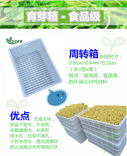 4)周轉箱的外徑尺寸:0.61m*0.44m*0.26m(長寬高),特點:波浪底,食品級的環保LLDPE材料,無味,結實不變形,不變色,承載強度大,長條形排水孔,豆芽不堵孔,不積水存水,透水效果好,防止濕度過大而導致爛牙。