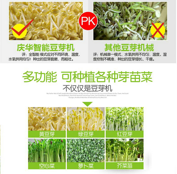 5、豆芽機產品特點: 1)我公司生產的全自動綠色無污染豆芽機,是現代技術與傳統工藝的結合。豆芽機通過微電腦自動控溫、自動加溫、自動顯示溫度、自動淋水,實現了生產過程的全自動化,具有省時、省工、低耗、無噪音等特點。 2)用我公司豆芽機生產的豆芽比傳統手工生產周期短質量好,一般手工生產豆芽的周期,夏季需4-5天,冬季需要7-8天,而豆芽機生產豆芽只要3-4天即可,且不受地理環境、氣候條件和季節的影響。 3)我公司豆芽機生產的豆芽不僅種類多,而且產量高,一斤豆種可生產10斤左右的豆芽。且人工控制的環境下,豆芽生長均勻一致,潔白鮮嫩、清脆多汁,口感清爽;不僅食用安全、營養豐富,還具有一定的食療保健作用。 4)節省勞力,操作方便。將浸泡后的豆種放進豆芽機育芽箱內,就不用管了,它會自動加溫,自動淋水,經過3-4天時間就可生產出潔白脆嫩的豆芽。